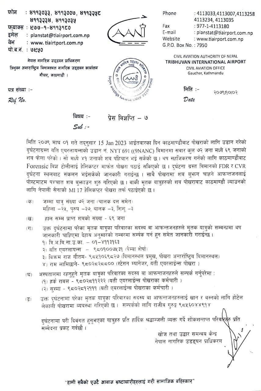 नेपाल नागरिक उड्डयन प्राधिकरणले पोखरामा शव बुझ्न चाहने आफन्तलाई पोस्टमार्टम पश्चात शव बुझाउन सुरु गरिएको जानकारी गराएको हो ।